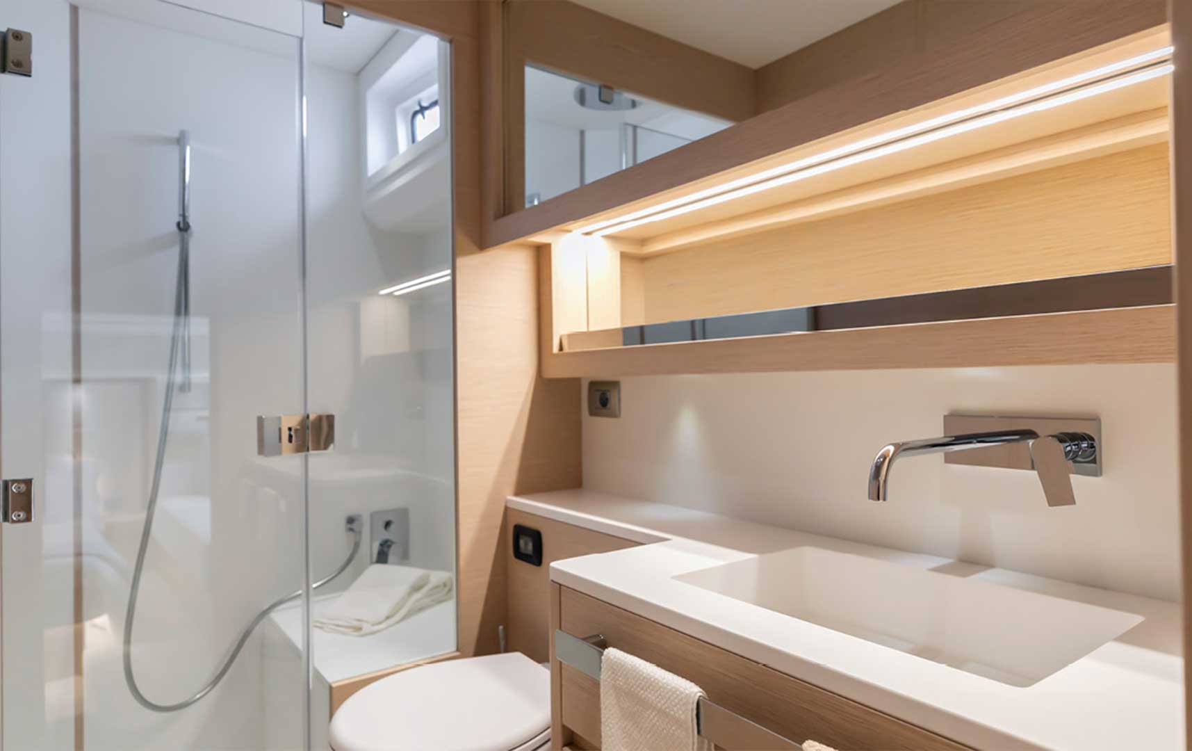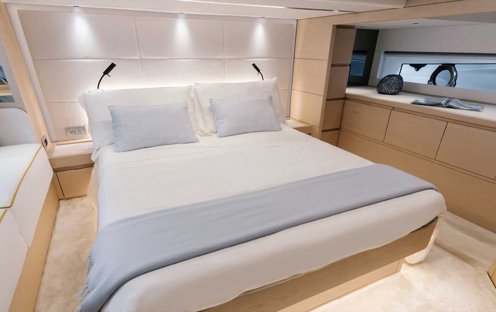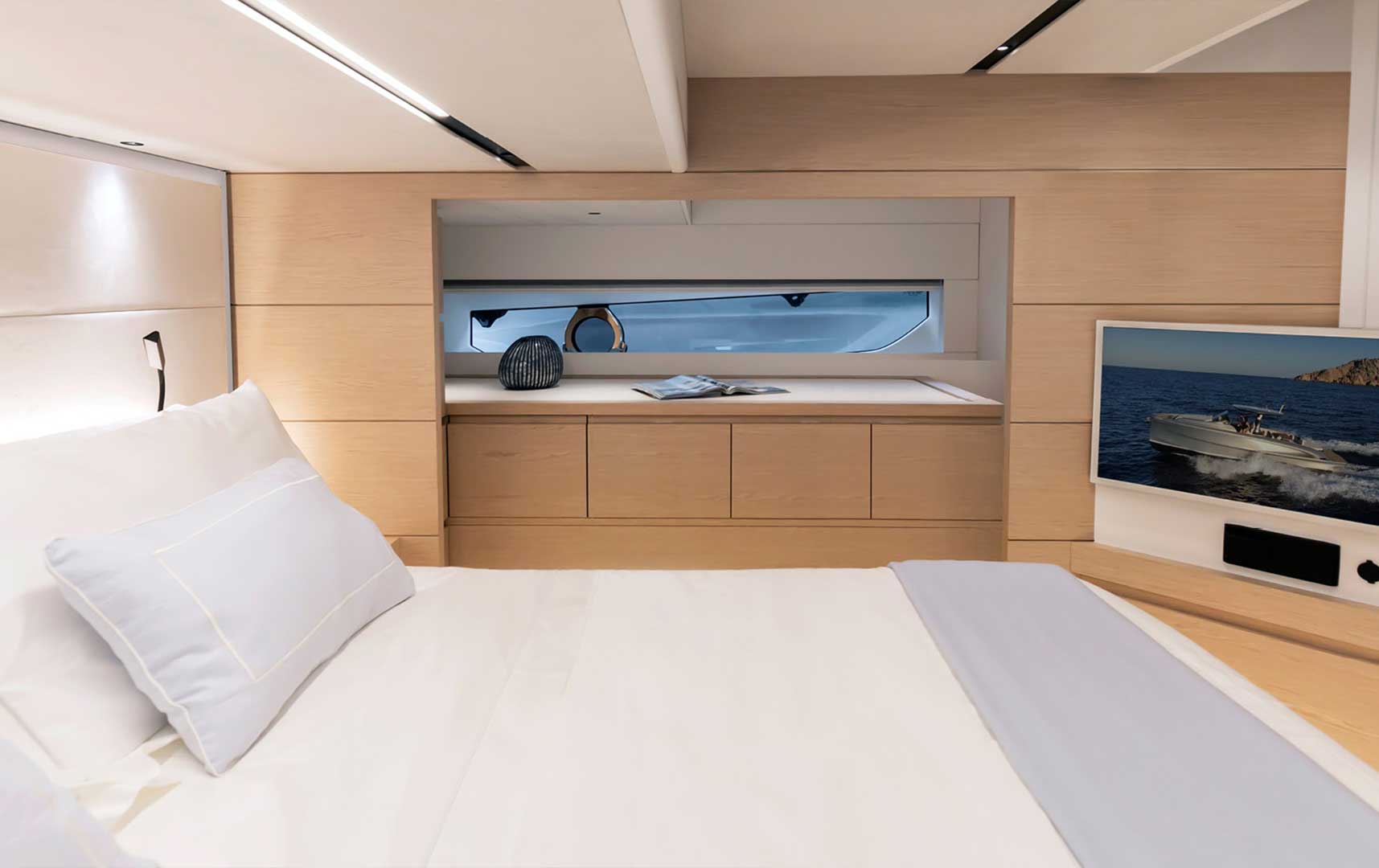 Generous hull windows allow natural light to flood the interior, creating a bright and welcoming atmosphere. The connection to the sea remains constant, even while relaxing below deck.