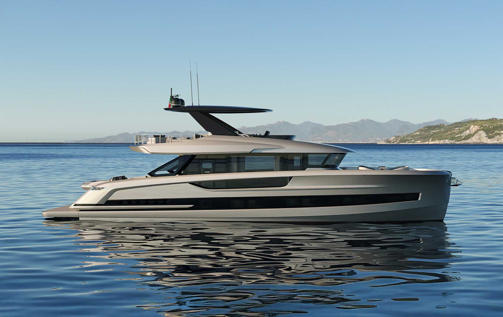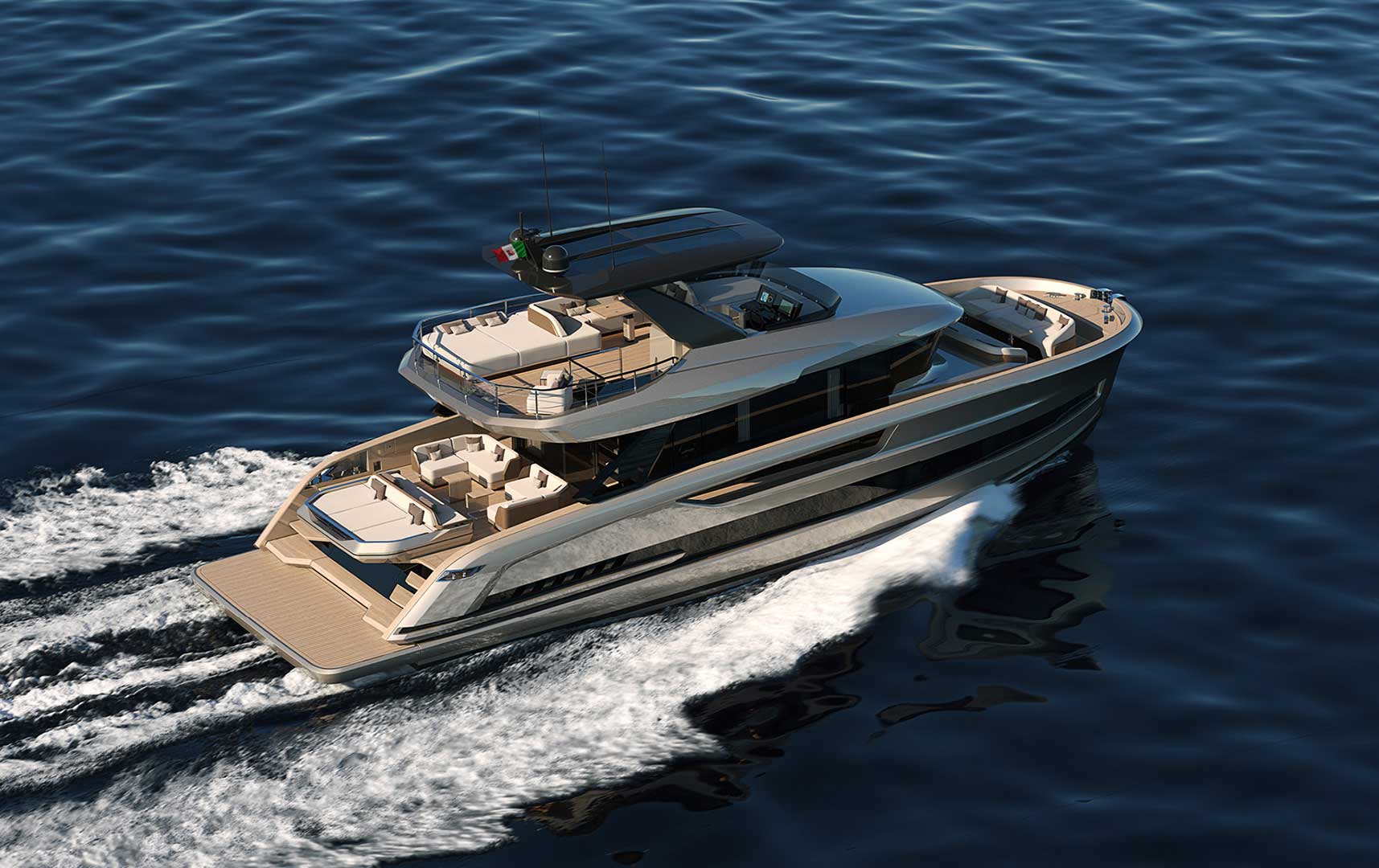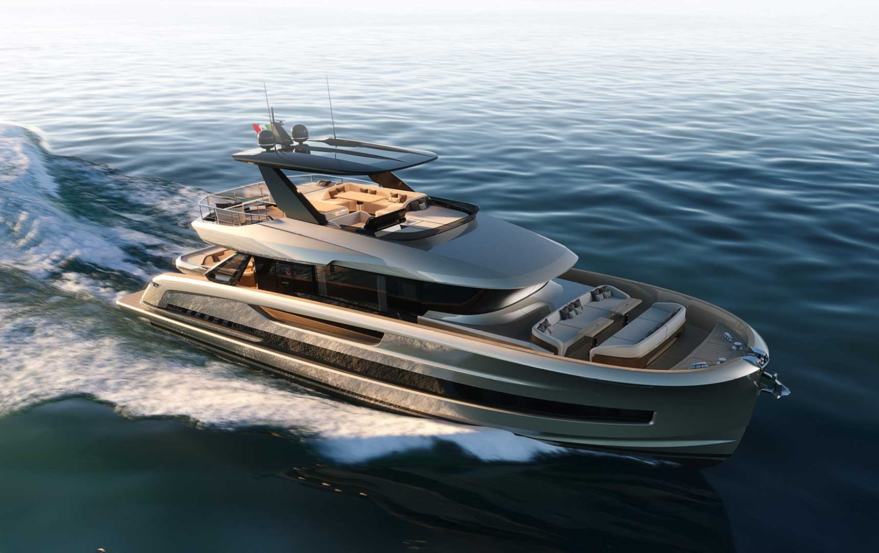 Designed as a true open-air living space, the flybridge offers generous areas for relaxation, dining, and socializing. With large seating zones, sunbeds, and a fully equipped pantry, it becomes the heart of onboard life during every journey.