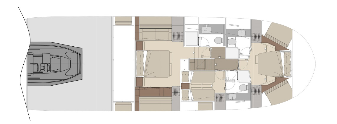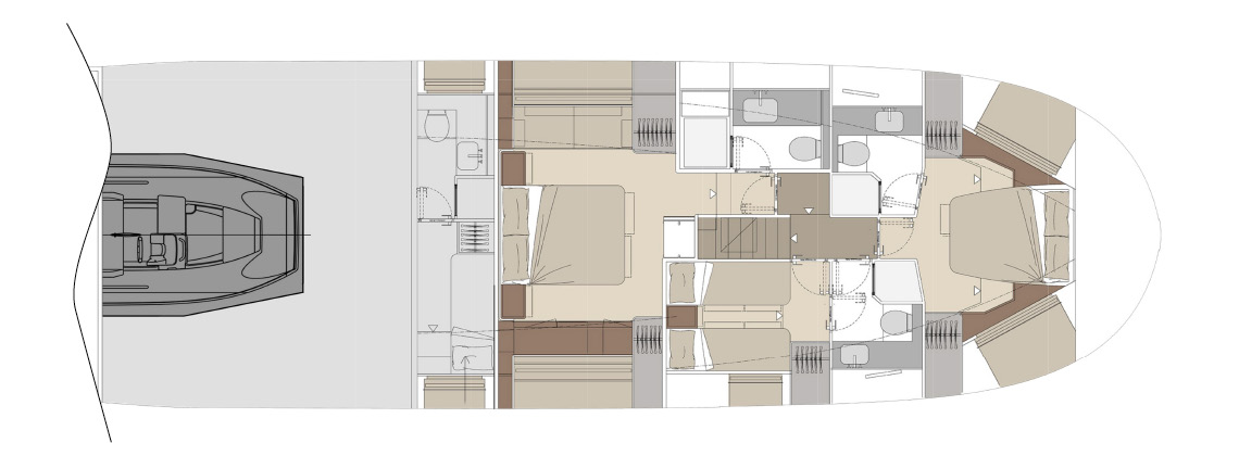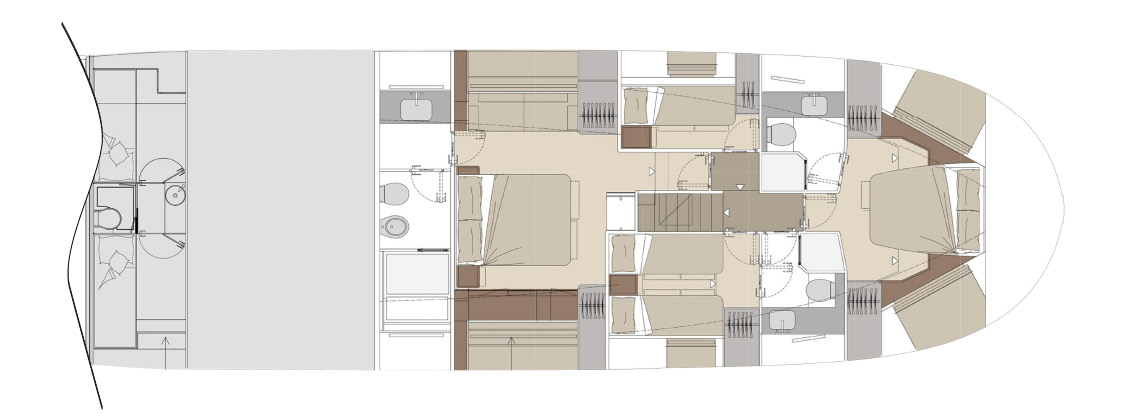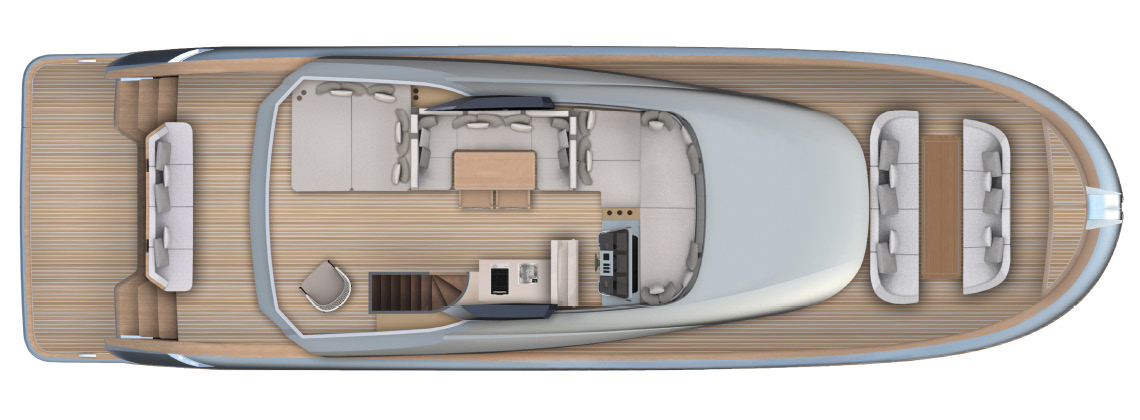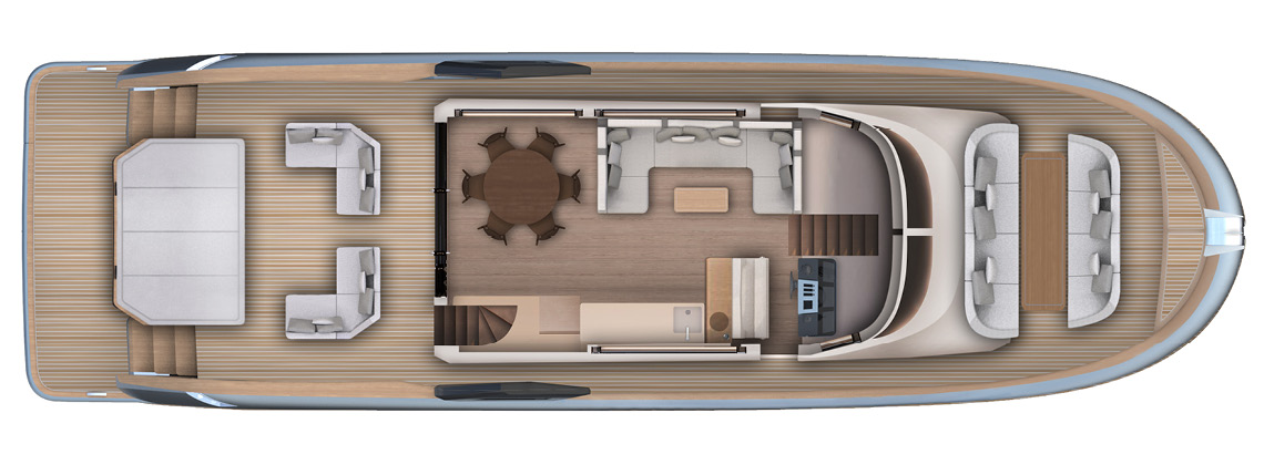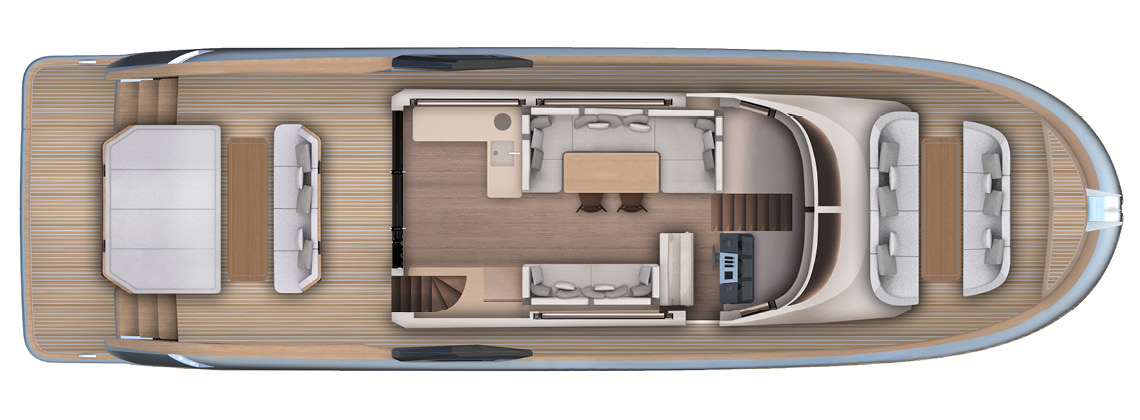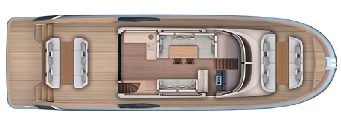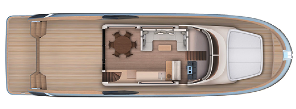 Designed as a true open-air living space, the flybridge offers generous areas for relaxation, dining, and socializing. With large seating zones, sunbeds, and a fully equipped pantry, it becomes the heart of onboard life during every journey.